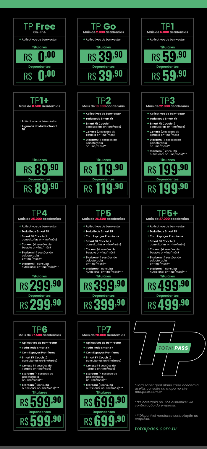 Total Fit: você vai usufruir as melhores academias e estúdios do Brasil. São mais de 3.500 unidades de treino disponíveis e diversas modalidades de atividade física para todos os gêneros e idades.